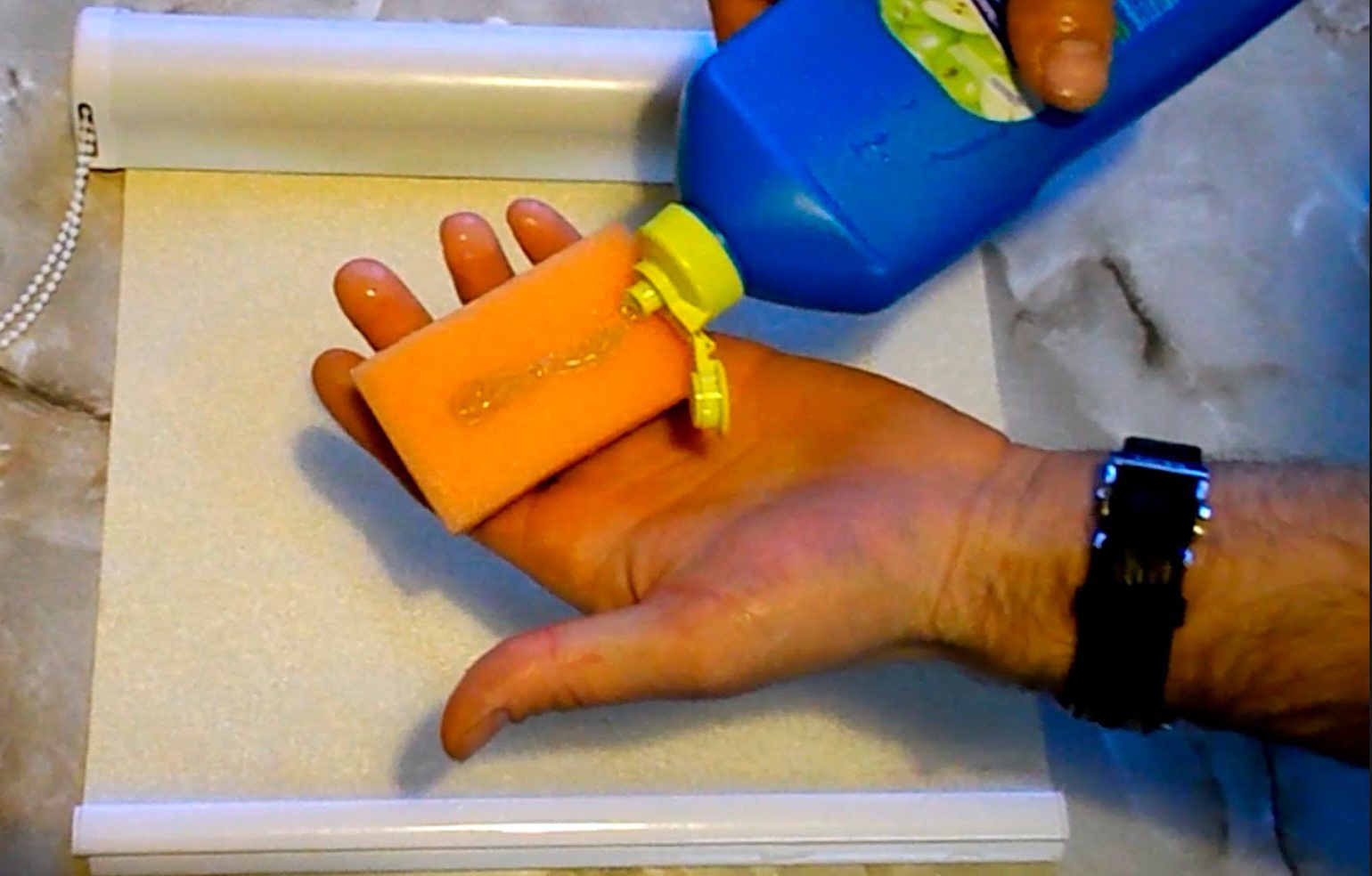 Пятно не поддается? Попробуйте вывести его с помощью мыльного раствора. Если пятно маленькое, намочите в растворе губку и аккуратно потрите. Если же оно достаточно большое, снимайте полотно с вала, несите его в ванную комнату, раскладывайте на дне ванной и стирайте с помощью губки. Не забудьте тщательно прополоскать полотно!